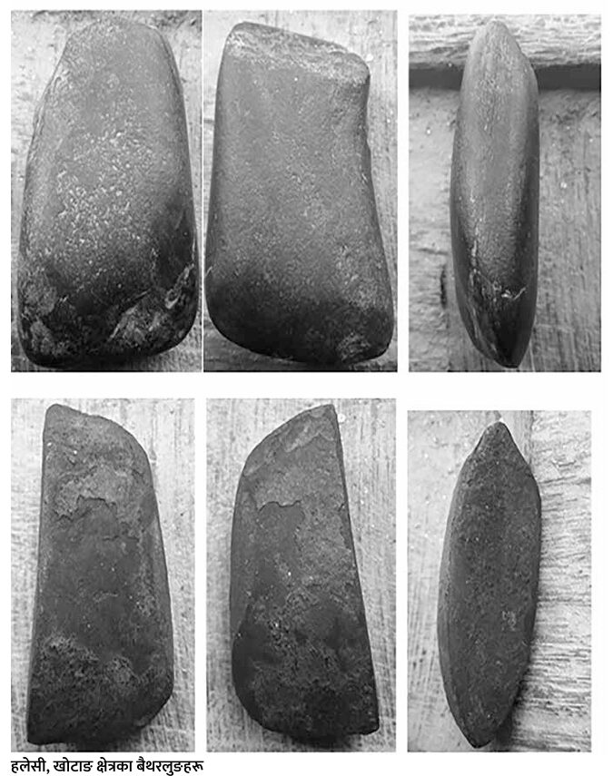 अन्तिमतिर आसामबाट बसाइँ सरेर काठमाडौं आइपुगेका थिए (मल्ल, २०१५) भन्ने तर्क गरेका छन्। वर्तमान ती मुन्डाहरू मध्यभारतको पहाडी भेगमा बसोबास गरिरहेको भए पनि त्यसभन्दा पहिले उनीहरू नेपालका हिमाली क्षेत्रका जङ्गलहरूमा लामो समय बसेको र किरात भाषामा मुन्डाकोल भाषाको प्रभाव रहेको चर्चा भारतको विस्तृत भाषिक सर्वेक्षण गरेका उल्लेख गरेका छन् Grierson (१९२७)। भारतीय इतिहास शिवप्रसाद डबराल (२०२५) को मतमा ती मुन्डाहरूलाई किरातहरूको ठूलो हुलले आफूमा समाहित गरेको हुनाले उनीहरूको स्वतन्त्र अस्तित्व बाँकी रहेको छैन। यी तथ्यहरूका आधारमा भन्न सकिन्छ। यदि पूर्वी पहाडका नवपाषाण उपकरण निर्माण तथा प्रयोग गर्ने प्रथम मानव समुदाय आसामबाट नेपाल प्रवेश गरेका मुन्डाहरू थिए भने पनि बैथरलुङ प्रयोग गरेर सिकार गर्ने मुन्डा र किरातहरू आदिम समयमै अन्तर्घुलित भइसकेका थिए। पाण्डेय र रेग्मी (२०६२) ले भक्तपुर जिल्लाको चाँगुनारायण मन्दिर नजिकै डुमाखालको उत्खननमा पाँचौं शताब्दीमा सुरु भएको लिच्छवि कालको ऐतिहासिक शिल्पकृतिहरूकै स्तरमा पाइएको प्रागऐतिहासिक नवपाषाण उपकरणलाई या त लिच्छिवि कालिक मानवले उपयोग गरेको या ऐतिहासिक कालको मानवले पुराना शिल्पकृति सङ्ग्रह गरेको हुनुपर्छ भनेर अनुमान गरेका छन्। त्यस्ता शिल्पकृतिहरू किन सङ्ग्रह गरिए र प्रयोजन के थियो भन्ने उत्तर उनीहरूले दिएका छैनन्। यस्ता शिल्प तथ्यहरू सङ्ग्रह गर्नुको केही कारण हलेसी क्षेत्र तथा पूर्वी पहाडमा गरिएको स्थलगत अध्ययनबाट खुलस्त भएको छ। सम्भवतः ऐतिहासिक लिच्छवी कालीन तहभित्र डुमाखालमा भेटिएको नवपाषाण उपकरण पूर्वी पहाडका किरात राईहरूले झैं सांस्कृतिक विश्वास, चट्याङ नियन्त्रक र औषधिका रूपमा प्रयोग गर्न संरक्षण गरिएको हुन सक्छ। यदि यो सही सावित भएमा त्यसले प्रागइतिहास कालमा पूर्वी पहाडदेखि काठमाडौं उपत्यकासम्म एउटै संस्कृति भएको समुदायको उपस्थिति थियो भन्न सकिन्छ।